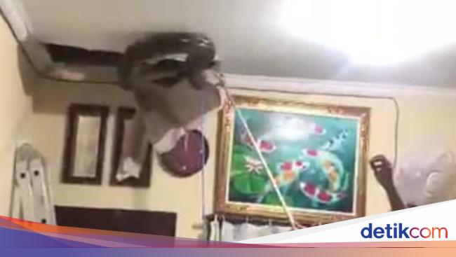 Di lokasi, tim Damkar langsung mengecek plafon rumah milik warga itu. Setelah dijebol ternyata ada ular piton sepanjang 5 meter.