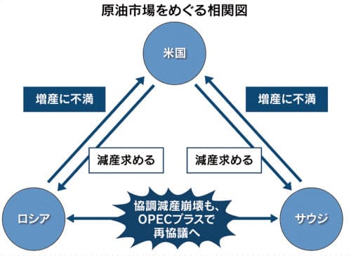 サウジの緊急会合の呼び掛けで目を引いたのは対象国の拡大だ。OPECプラスに加え「ほかの産油国グループ」にも参加を求めた。シェールオイルの増産で世界最大の産油国に浮上したにもかかわらず、これまでは国際的な生産調整の枠外だった米国の存在がサウジ側の念頭にある。