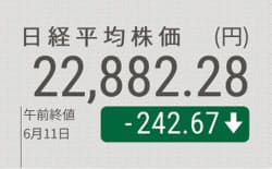 11日午前の東京株式市場で日経平均株価は反落し、前日比242円67銭(1.05%)安の2万2882円28銭で終えた。高値警戒感から利益確定売りが出やすかったうえ、円高・ドル安が進行して輸出関連株を中心に幅広い銘柄に売りが広がった。下げ幅は300円超まで拡大する場面があった。