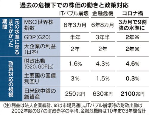 わずか3カ月半での9割回復は、過去の危機と比べると異例の速さだ。00年のIT(情報技術)バブル崩壊時や、07年に株価がピークをつけた金融危機では、高値回復に6年以上かかった。15年に中国景気が急減速した「チャイナ・ショック」でも2年弱かかった。