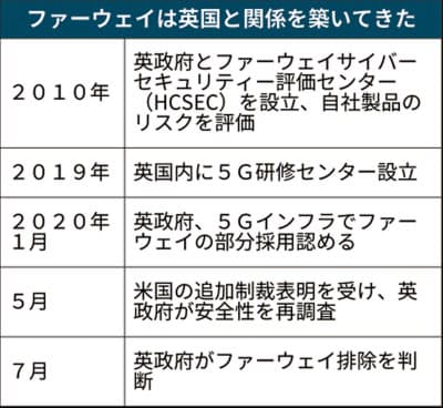 政府が14日に開いた国家安全保障会議でファーウェイの完全排除を決めた。21年以降はファーウェイの製品の新規購入も禁止する。ダウデン英デジタル・文化相は同日の議会下院で、「5月の米国の追加制裁が決定的だった。ファーウェイの供給網が不確実になり、セキュリティーの安全性を保つことが難しくなった」と説明した。