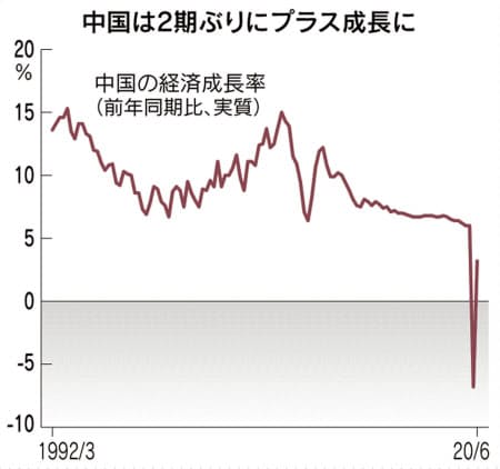 中国の実質GDPは1~3月に前年同期比6.8%減り、四半期の成長率を公表し始めた92年以降で初のマイナスだった。中国は3月中旬には新型コロナの感染拡大を止め、2四半期連続のマイナス成長による「景気後退」は回避した。