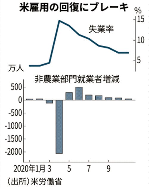 【ワシントン=河浪武史】米労働省が4日発表した11月の雇用統計(速報値、季節調整済み)は、失業率が前月から0.2ポイント下がって6.7%となり、7カ月連続で改善した。低下幅は縮小しており、新型コロナウイルスの再拡大でサービス業を中心に雇用回復にブレーキがかかりつつある。
