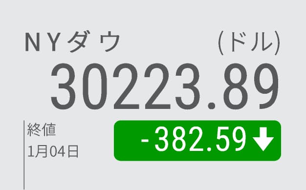 【NQNニューヨーク=古江敦子】4日の米株式市場でダウ工業株30種平均は3営業日ぶりに反落し、前営業日の昨年12月31日に比べ382ドル59セント(1.3%)安の3万0223ドル89セントで終えた。5日のジョージア州の上院決選投票を前に持ち高調整や利益確定の売りが優勢となった。新型コロナウイルスの感染拡大も投資家心理を冷やした。