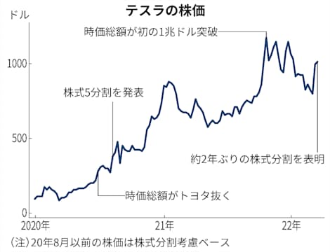 テスラが20年8月に1株を5株に分割すると表明した際には、発表直前から効力発生日までの約3週間で株価は約80%上昇した。脱炭素の流れを追い風にその後も上昇基調が続き、21年10月には時価総額が自動車メーカーとして初めて1兆ドル(約123兆円)の大台を突破した。