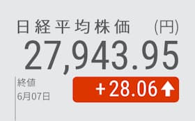 7日の東京株式市場で日経平均株価は小幅に3日続伸し、前日比28円06銭(0・1%)高の2万7943円95銭で終えた。3月30日以来およそ2カ月ぶりの高値水準。円相場の下落を背景に輸出関連株を中心に買いが入った。日経平均の上げ幅は一時170円を超え、取引時間中として約2カ月ぶりに節目の2万8000円を上回る場面もあったが、利益確定の売りなども出て上値を抑えた。