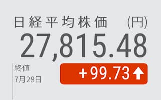 28日の東京株式市場で日経平均株価は続伸し、大引けは前日比99円73銭(0.36%)高の2万7815円48銭だった。米連邦公開市場委員会(FOMC)後のパウエル米連邦準備理事会(FRB)議長の発言を受けた前日の米株式相場の大幅な上昇を引き継ぎ、東京市場でも買いが優勢だった。朝方には取引時間中では6月10日以来、およそ1カ月半ぶりに2万8000円台をつけたが、その後は利益確定売りに押されて下げに転じる場面もあった。外国為替市場で一時1ドル=135円台前半まで円高・ドル安が進んだことも、輸出関連株を中心に株式相場全体の重荷となった。