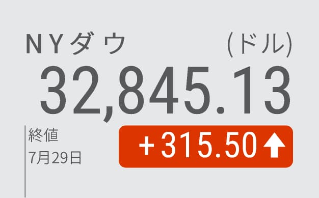 【NQNニューヨーク=横内理恵】29日の米株式市場でダウ工業株30種平均は3日続伸し、前日比315ドル50セント(1.0%)高の3万2845ドル13セントと6月上旬以来の高値で終えた。前日夕に発表したハイテク大手の決算が堅調だったと受け止められ、投資家心理が一段と改善した。原油高を受けて29日朝発表の決算が大幅増収増益となった石油のシェブロンも買われ、ダウ平均を押し上げた。