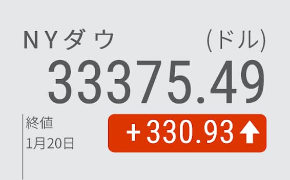 【NQNニューヨーク=川内資子】20日の米株式市場でダウ工業株30種平均は4営業日ぶりに反発し、前日比330ドル93セント(1.0%)高の3万3375ドル49セントで終えた。前日夕に2022年10~12月期決算を発表した動画配信のネットフリックスが急伸。ハイテク株全般への買いに波及し、相場上昇をけん引した。