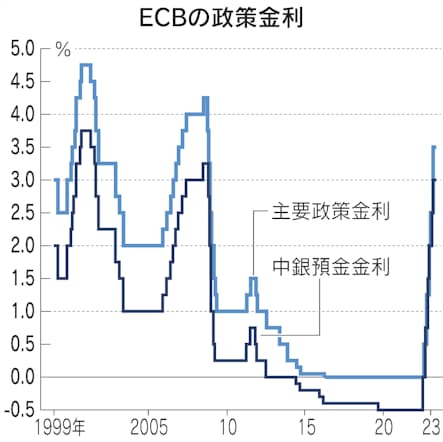 【フランクフルト=南毅郎】欧州中央銀行(ECB)は16日の理事会で、3会合連続となる0.5%の大幅利上げを決めた。スイスの金融大手クレディ・スイス・グループの経営不安などが高まったものの、インフレ抑制を優先した格好だ。ラガルド総裁は「すべての手段を使って対応する用意がある」と述べ、欧州金融システムの安定を保つことを強調した。