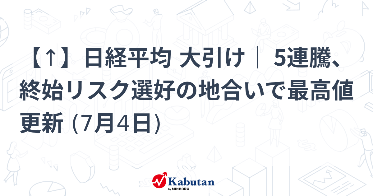 0 Response to "【↑】日経平均 大引け| 5連騰、終始リスク選好の地合いで最高値更新 (7月4日) - minkabu PRESS"